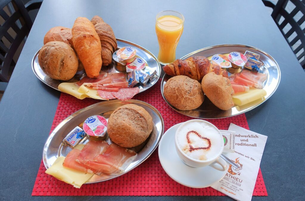 Brotauswahl, Gipfeli, Brötchen, Walliser Rohschinken, Salami, Walliser Käse, gekochte Eier, Früchte, Joghurt, Saft, Kaffee, Tee, Warme Schokolade